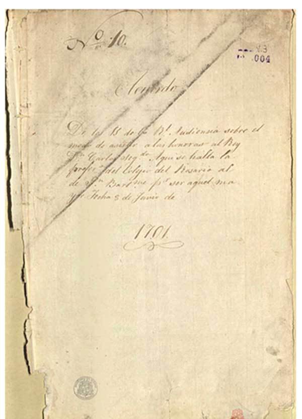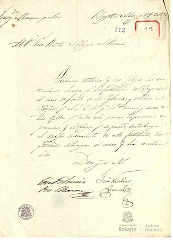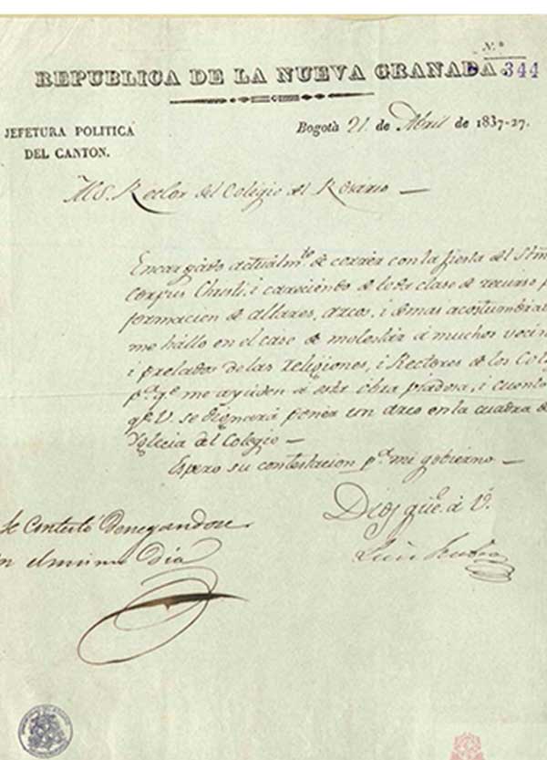Solicitud al rector del Colegio Mayor del Rosario para ornamentos en el Corpus Christi