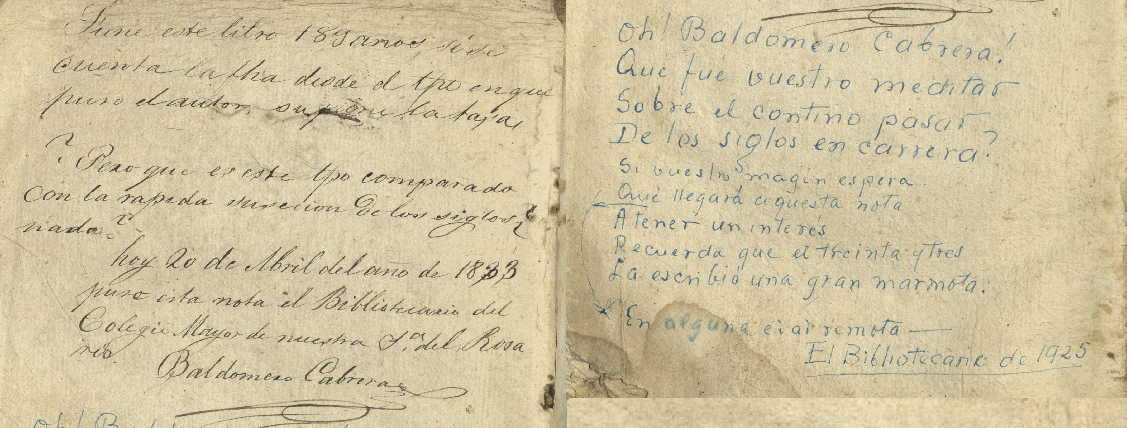 Como ya se ha visto en este blog, las guardas de los libros tienen vida, ora se defienda una escuela filosófica, ora se aconseje la lectura de un autor clásico. La cosa puede dar para desahogos más ligeros, con cierto tinte filosófico: un bibliotecario se pregunta si siglo y pico es poco o nada, a lo que le responde un colega, de otro siglo (que ya ustedes me dirán si es nonada, para usar un arcaísmo), con una graciosa décima. La obra huésped, si se nos permite el biologismo, es Instituciones politicas: al serenissimo señor don Baltasar Carlos, principe de las Españas, y Nuevo Mundo, por Diego de Tobar Valderrama (Madrid, 1645). Ahora veamos lo que ponen las guardas: Primera nota: Tiene este libro 189 años, si se cuenta la f[ec]ha desde el t[iem]po en que puso el autor [...] la tasa. ¿Pero que es este t[iem]po comparado con la rapida susecion de los siglos? nada? hoy 20 de Abril del año de 1833 puso esta nota el Bibliotecario del Colegio Mayor de nuestra S[eñor]a del Rosa- rio Baldomero Cabrera Cabrera podría ser el mismo que aparece registrado como estudiante de Filosofía y Jurisprudencia, en el periodo 1828-32. Segunda nota: Oh! Baldomero Cabrera! Qué fué vuestro meditar Sobre el contino pasar De los siglos en carrera? Si vuestro magín espera Que llegará aquesta nota A tener un interés Recuerda que el treinta y tres La escribió una gran marmota En alguna edad remota. El Bibliotecario de 1925 No se identifica pero, por la época y las aficiones poéticas, debe de ser Juan Francisco Franco Quijano. Sobre este personaje, recomendamos: Franco Quijano.