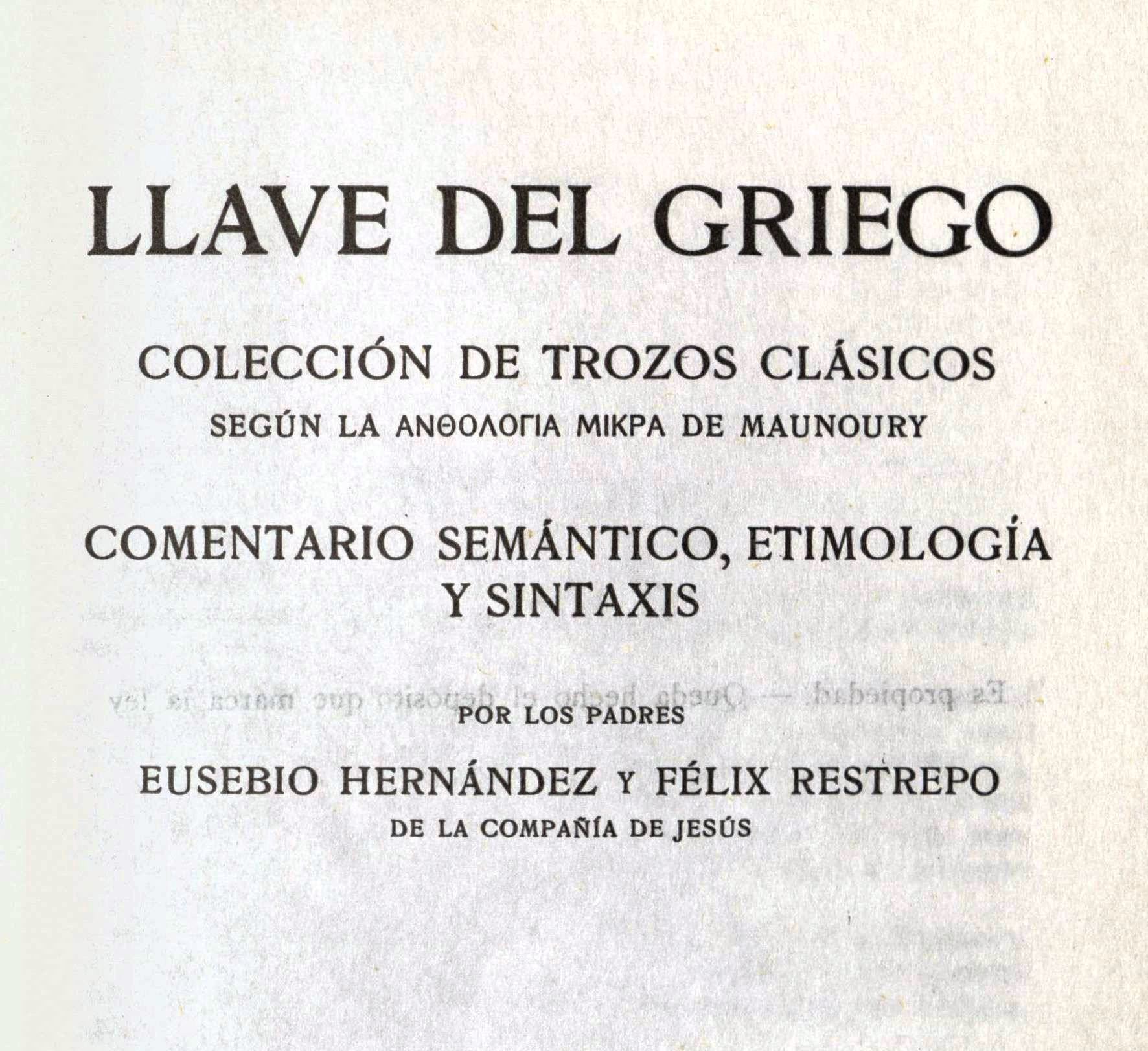 En la casa Herder, de Friburgo de Brisgovia, salía a la venta, en 1912, una obrita dedicada al aprendizaje de la lengua griega clásica. Sus autores, dos jesuitas: Hernández, español; Restrepo, colombiano.