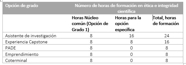Complementando lo anterior y a) asumiendo que las Opciones de Grado tienen mayor alcance y profundidad en materia de investigación y b) exponen más ampliamente a los estudiantes a dilemas éticos y de integridad científica, se plantea la necesidad de incorporar la formación ética en estos espacios de formación, de manera diferenciada, de la forma como se describe en la Tabla 1.
