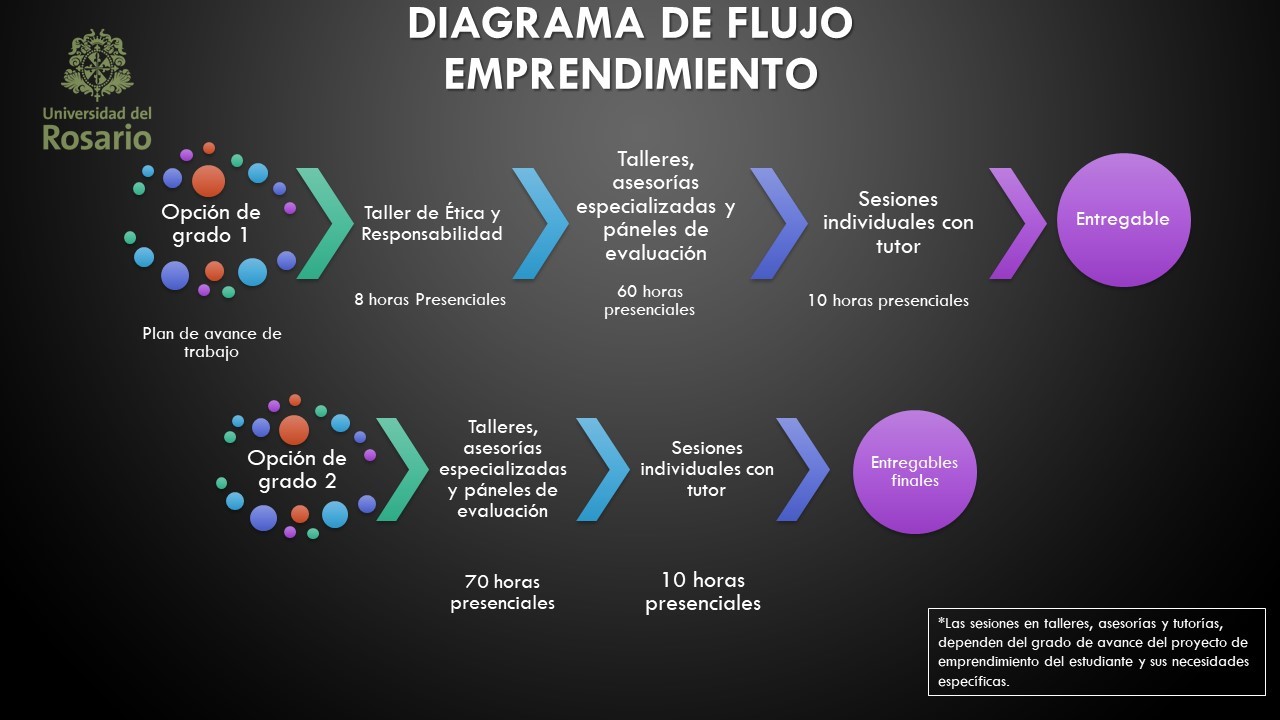 La Opción de Grado de Emprendimiento que se ofrece a los estudiantes de pregrado continuará teniendo el mismo enfoque de las versiones anteriores y se desarrollará en función de los lineamientos que defina el Centro de Emprendimiento de la Universidad del Rosario. Al igual que las otras opciones de grado, la de Emprendimiento se estructura en dos momentos (Opción 1 y 2) y se desarrolla de la siguiente forma: