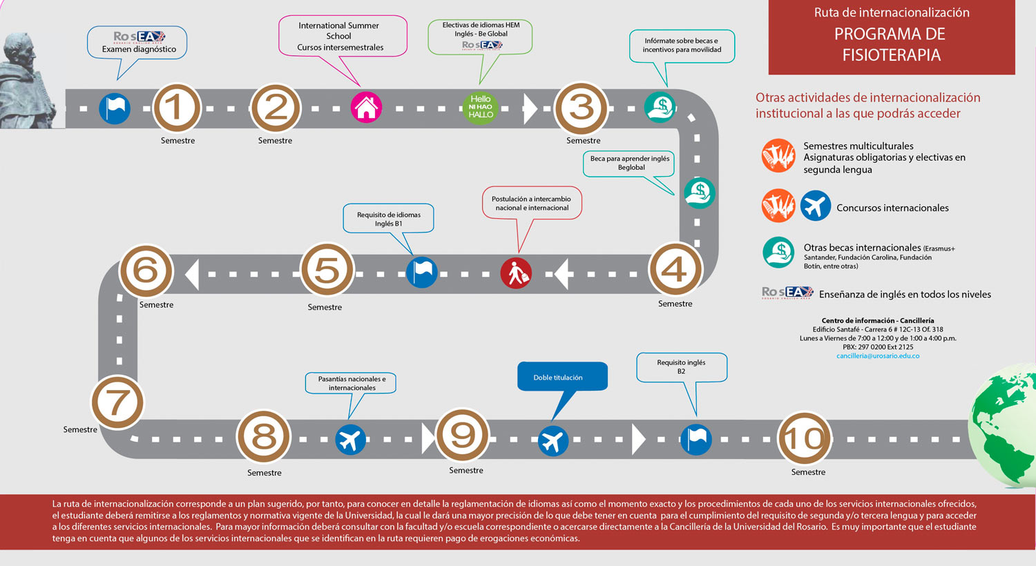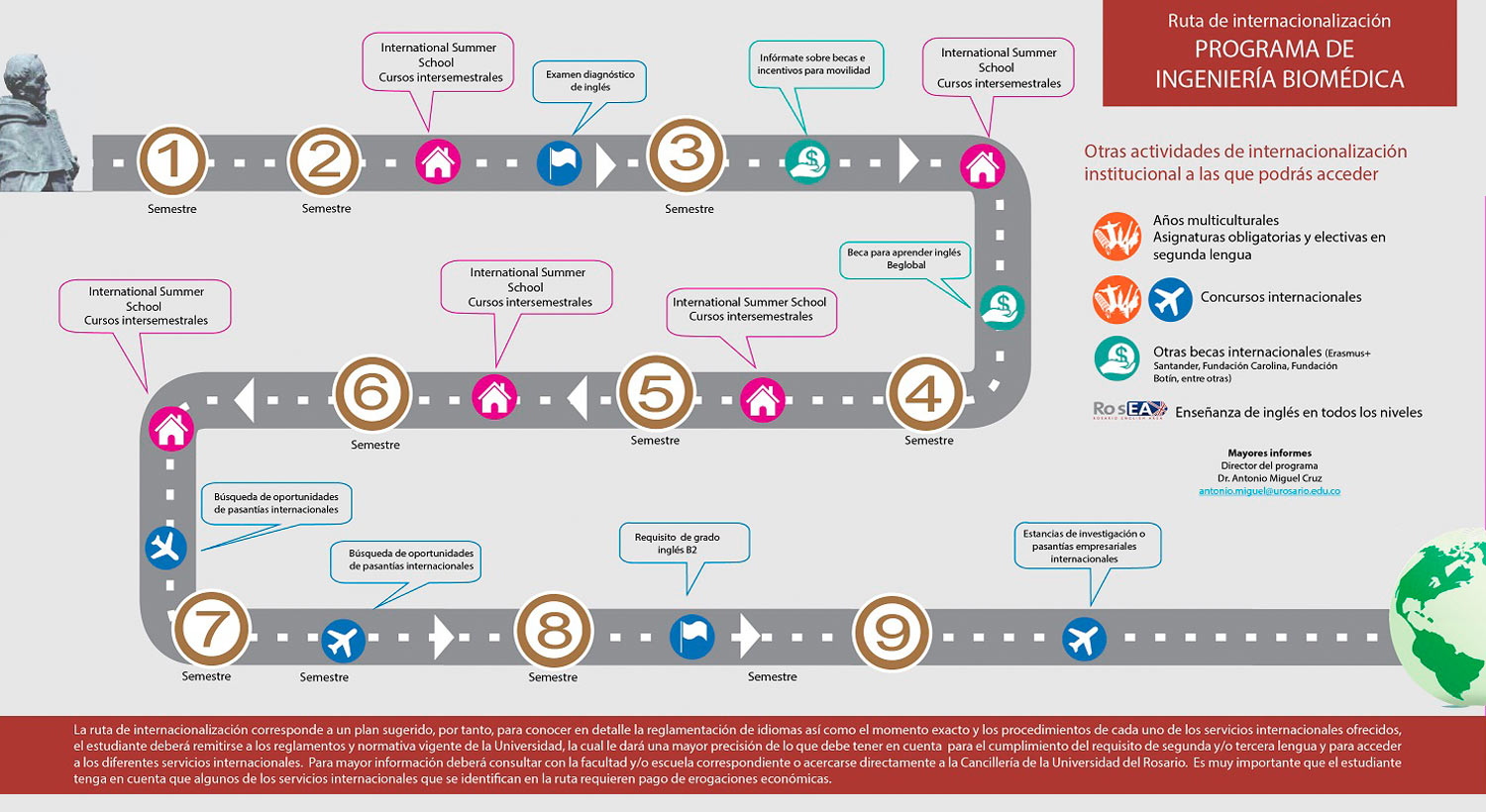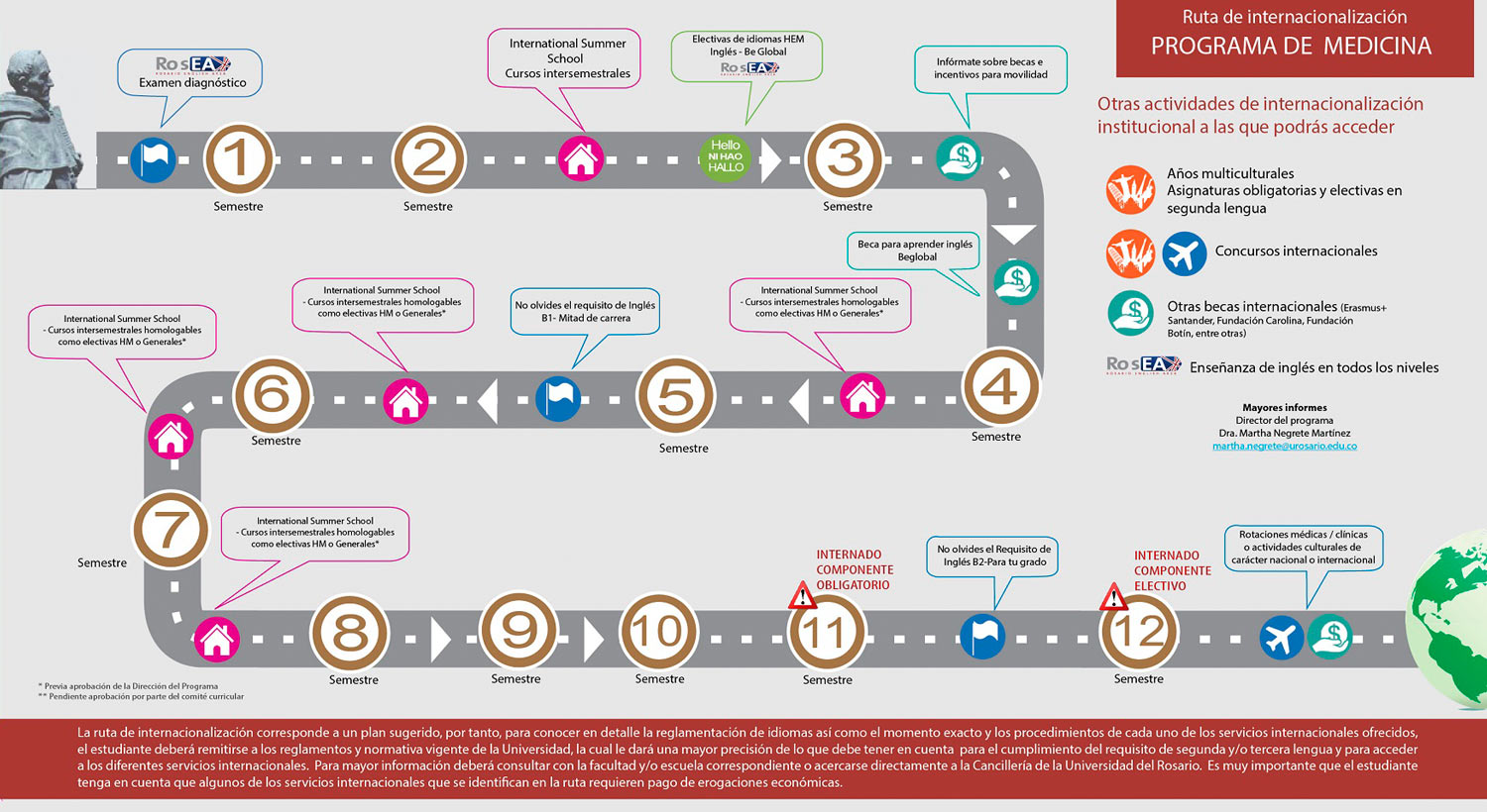 De acuerdo con la política institucional de internacionalización y con la estructura curricular de los programas de pregrado y posgrado en la Escuela de Medicina y Ciencias de la Salud, se han diseñado infografías particulares que buscan orientar al estudiante en la ruta sugerida para tener en cuenta el cumplimiento de requisitos de segundo idioma, oportunidades de cursar asignaturas en inglés o planificar sus semestres internacionales.