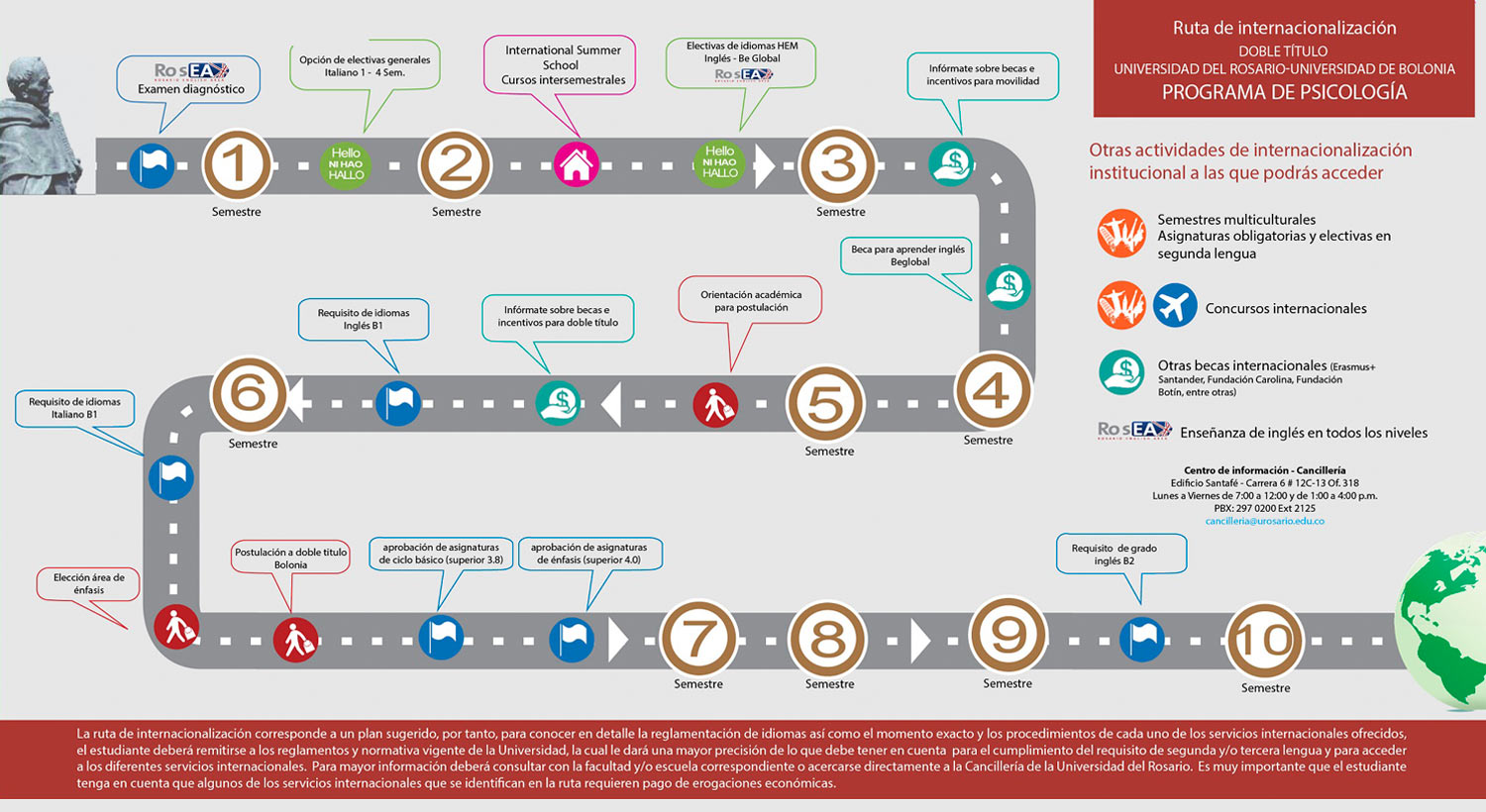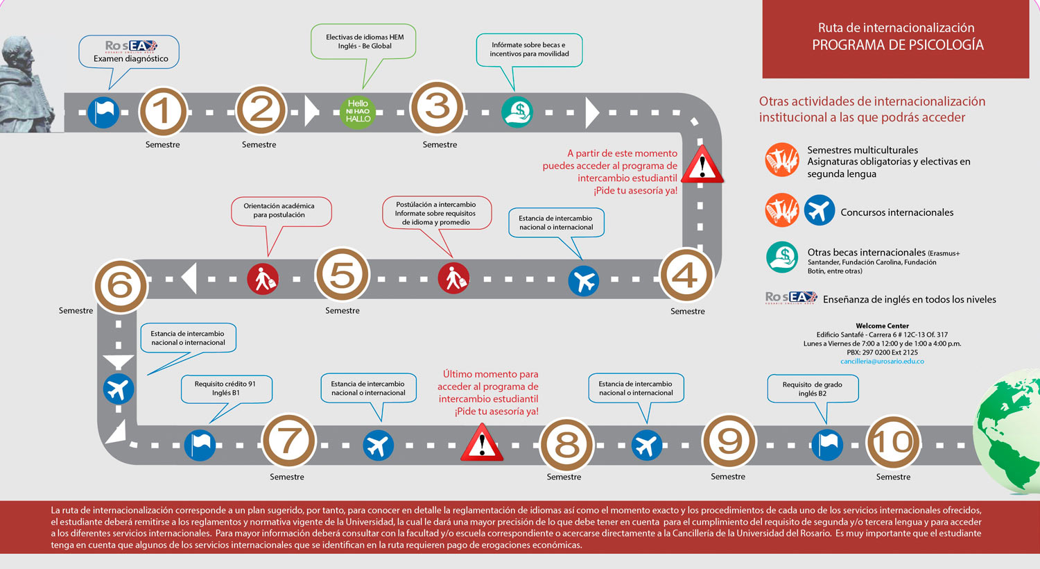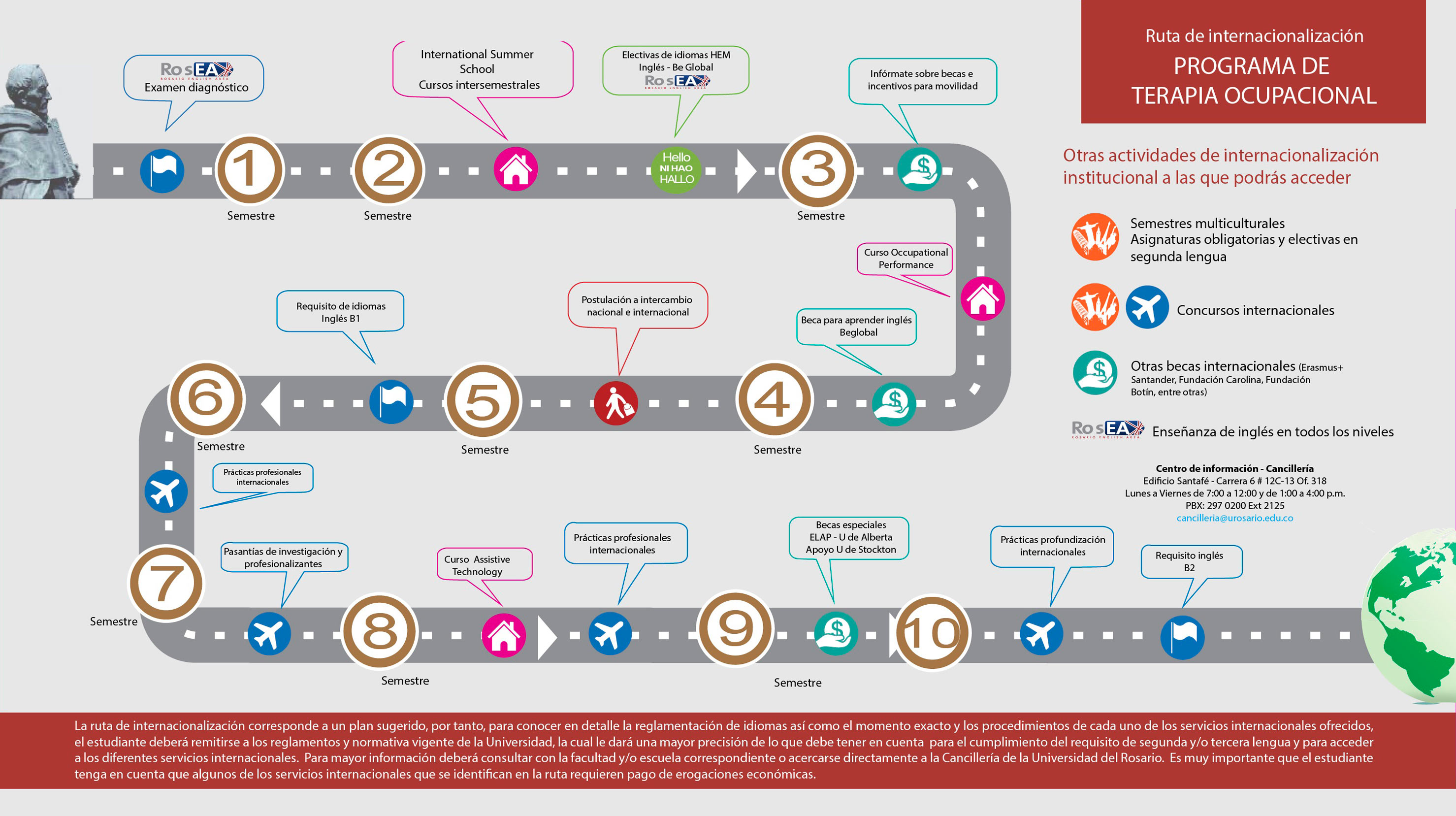 De acuerdo con la política institucional de internacionalización y con la estructura curricular de los programas de pregrado y posgrado en la Escuela de Medicina y Ciencias de la Salud, se han diseñado infografías particulares que buscan orientar al estudiante en la ruta sugerida para tener en cuenta el cumplimiento de requisitos de segundo idioma, oportunidades de cursar asignaturas en inglés o planificar sus semestres internacionales.