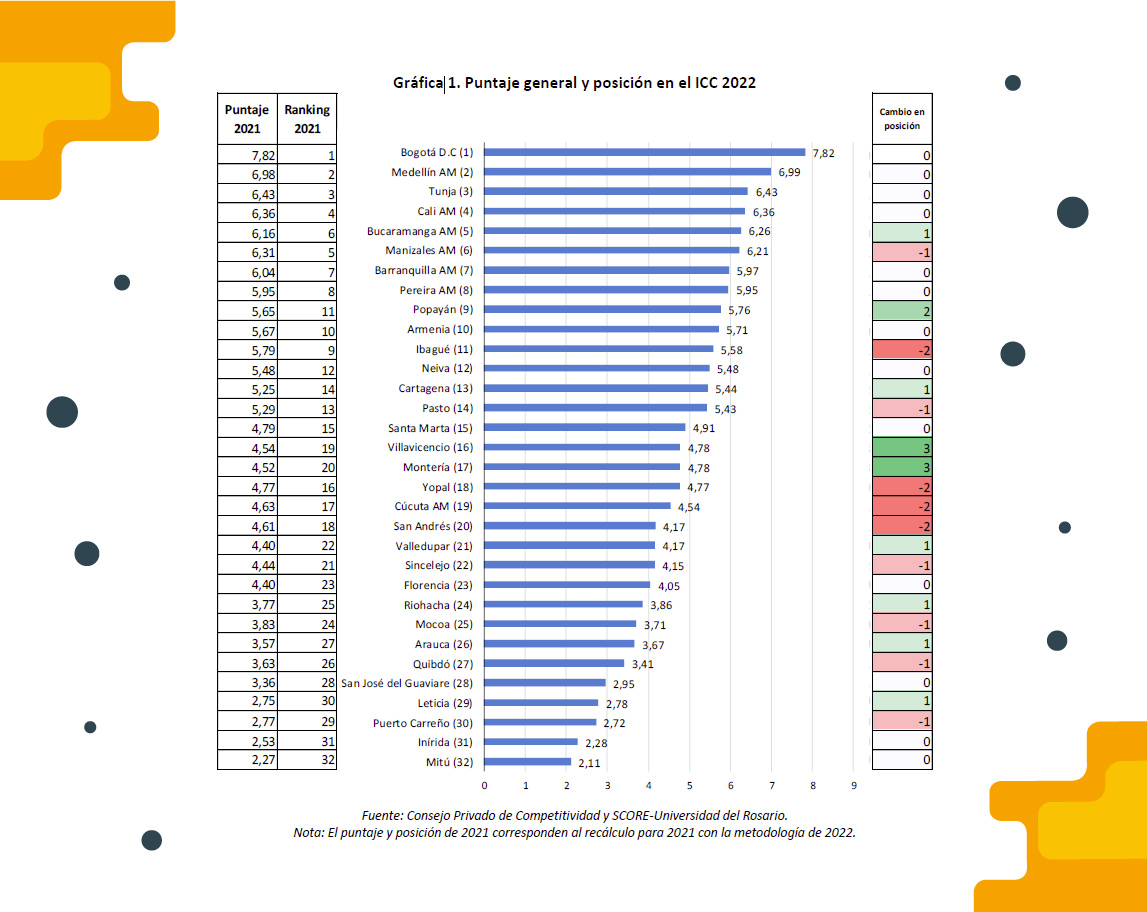 El índice de competitividad de ciudades en su versión de 2022 está encabezado por Bogotá D.C. con un puntaje de 7,8 sobre 10, seguido por Medellín AM (6,99); Tunja (6,43); Cali AM (6,36) y Bucaramanga AM (6,26) (Gráfico 1).