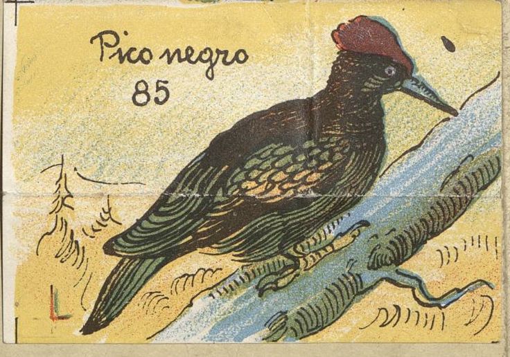 La laminita n.o 85 apareció en uno de los libros de la Colección de Espasa-Calpe que conserva el Archivo Histórico. Esta es una colección de aproximadamente 300 volúmenes de obras de literatura, historia y filosofía clásica.  Pico negro es el nombre que se le dio al Pito Negro (Dryocopus martius), un ave de la familia de los pájaros carpinteros que habita los bosques templados de Europa y Asia[2].