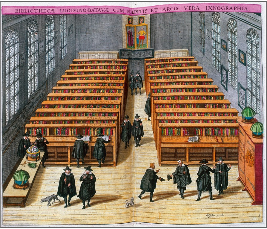 Con esta información documental, podemos detenernos a observar el aspecto de una biblioteca antigua. Se trata del grabado de la Biblioteca de la Universidad de Leiden, en el siglo XVII. Se trata de un dibujo de Jan Cornelis van't Woudt (1570-1615), grabado por Willem Isaacsz. van Swanenburg (1580-1612) en 1610. La obra se imprimió varias veces y con variantes de detalle, incluso coloreada.