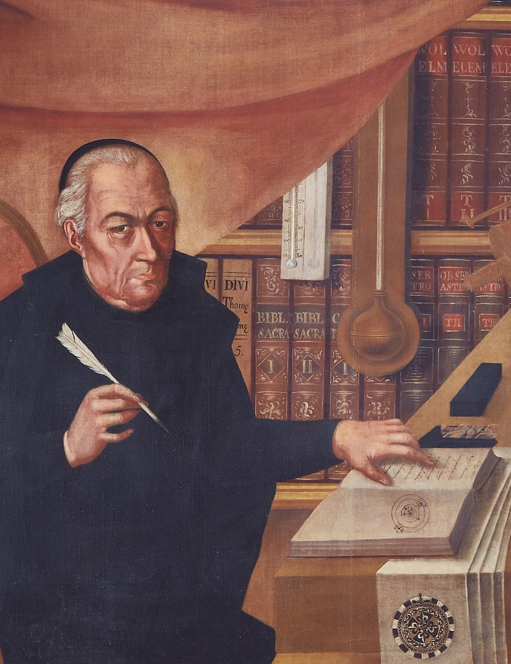 Comencemos por el más reciente. En un retrato de Lorenzo María Lleras (1811-68), atribuido a Luis García Hevia (1837), en la impresionante biblioteca se camufla un termómetro. El joven Lleras debió conocer el uso del instrumento cuando estudiaba Filosofía en el Rosario: el segundo año del trienio se dedicaba a la Física, en cuyo temario estaba “la aerometría con la descripción, uso y experiencias de la máquina pneumática, termómetro, barómetro, y el tratado de los meteoros”[1]. En las obras de Wolff se dan las instrucciones para construir un termómetro y su imagen se ilustra en grabados.