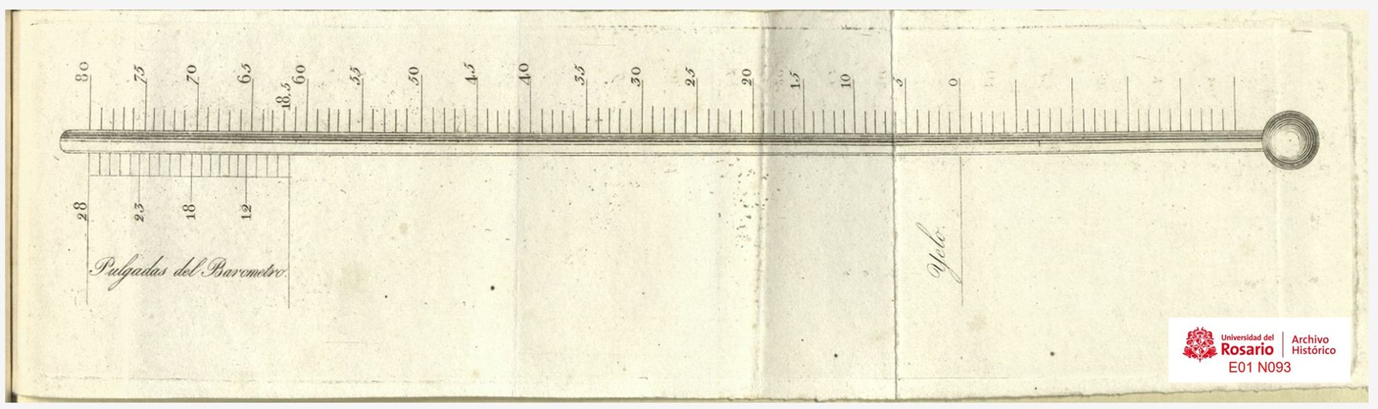 Reproducción del termómetro de Caldas, en su Ensayo (1819). Usa la escala de Réaumur, de 0 a 80 (congelación y ebullición, respectivamente).