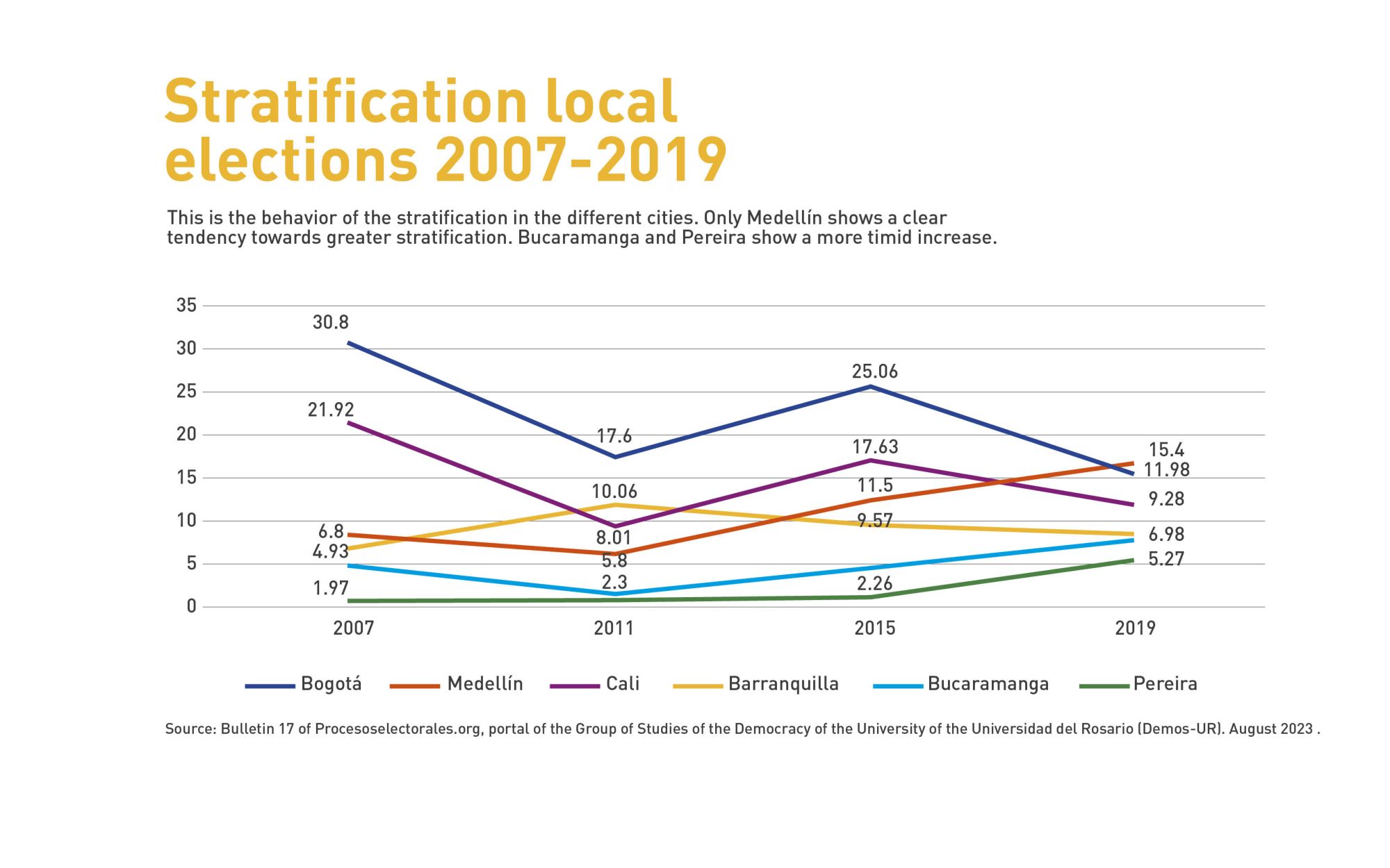 Likewise, the data of his observations indicate that in some cities there are cycles of alternation: “Cali, for example, shows that after very stratified elections, there come others that are not so stratified. This means that there is more alternation between candidates who polarize socially and others who achieve greater consensus in the population.” In the Stratification graph of the local elections between 2007 and 2019, it can be seen that stratification only grows in Medellín, but it is not so in the rest of the cities. In more detail, the 2019 elections in Medellín, in which Daniel Quintero was elected, show a strange event in the city: a high stratification above the historical trend of the city, which, like other large cities, used to vote with a very little stratification. dominated by traditional parties or those initiatives that gathered consensus (such as that of Federico Gutiérrez).