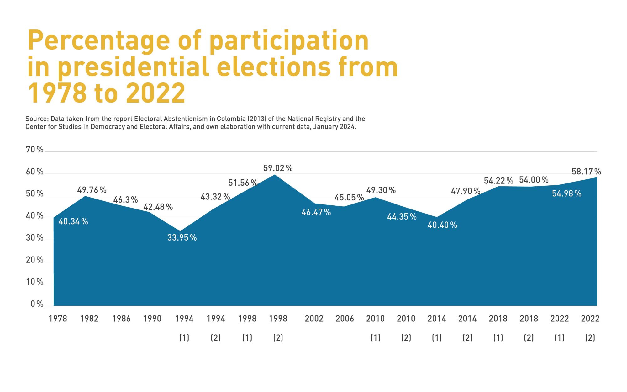 However, the vote is only one component of a democracy and it is not enough for citizens to give our full trust in our politicians and their parties. A country needs much more than elections to function; above all, it requires strong and transparent institutions and control processes that grant independence to the three branches of power. Perhaps this is why, historically, abstention in Colombia has been very high. Since 1978, at the end of the National Front, abstention has exceeded 50 percent in the majority of electoral events. In the 1994 elections it reached 66 percent, and in the plebiscite on the 2016 peace agreement it was 62.6 percent. Only in the 1998 presidential elections was there a respite, both in the first round (48.1 percent) and in the second (41 percent). However, it took another 20 years (the presidential elections of 2018) for abstention not to exceed the 50% threshold.