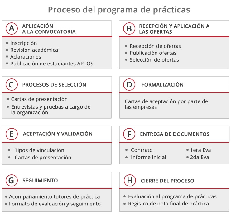 De acuerdo con tu programa en la Escuela de Administración, debes cumplir con los siguientes requisitos para aplicar a la convocatoria de búsqueda de práctica: