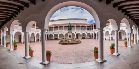 Histórico Claustro de la Universidad del Rosario con la estatua de Fray Cristóbal de Torres. Un rincón emblemático de la educación superior en Bogotá, Colombia.