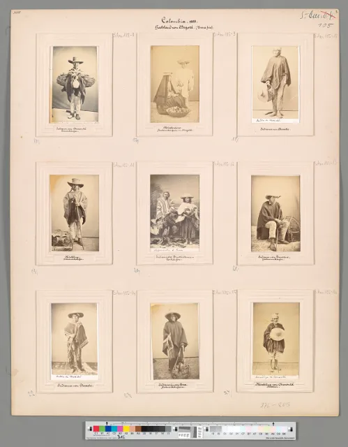 Descripción: Nueve “Fotografías de tipos” puestas sobre un folio blanco. Alphons Stübel montó en folios de cartón la mayor parte de las fotografías adquiridas en el territorio colombiano, por compra o donación, con el objetivo de exponerlas en el Museo de Geografía comparada, localizado en la ciudad alemana de Leipzig, el cual fundó en 1896. Cabe mencionar que este museo fue cerrado en 1975 (Schuster y Neva, 2022, pp. 34-35).