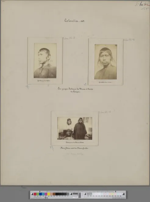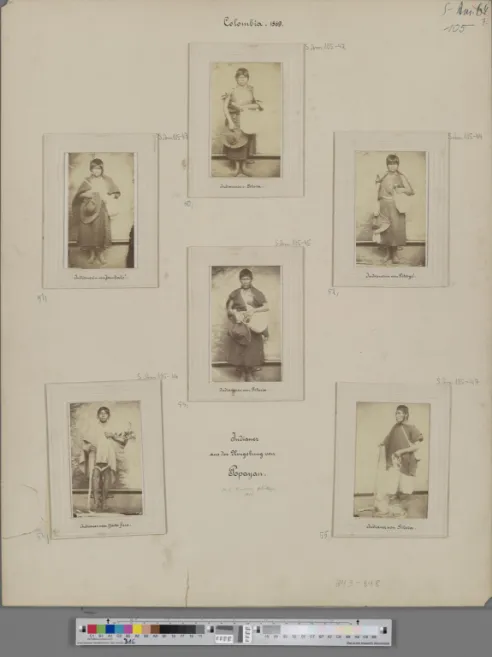 Descripción: Seis fotografías de indígenas habitantes de la región del Cauca. Alphons Stübel montó en folios de cartón la mayor parte de las fotografías adquiridas en el territorio colombiano, por compra o donación, con el objetivo de exponerlas en el Museo de Geografía comparada, localizado en la ciudad alemana de Leipzig, el cual fundó en 1896. Cabe mencionar que este museo fue cerrado en 1975 (Schuster y Neva, 2022, pp. 34-35).