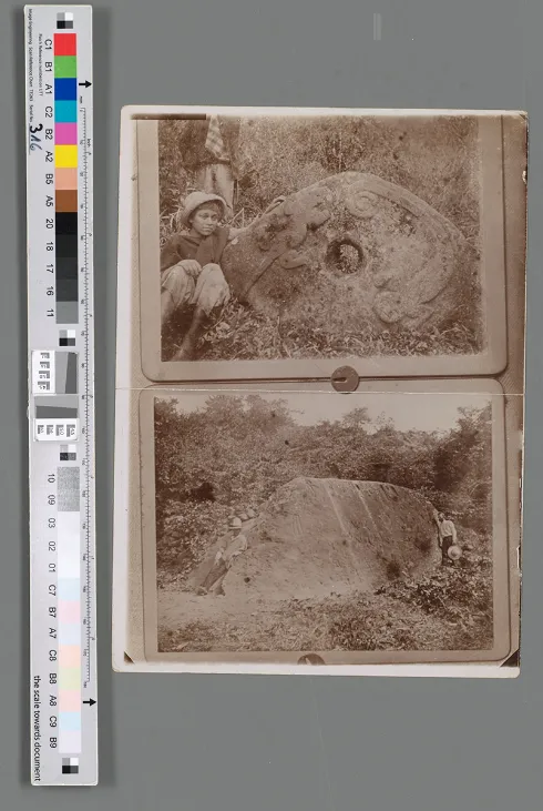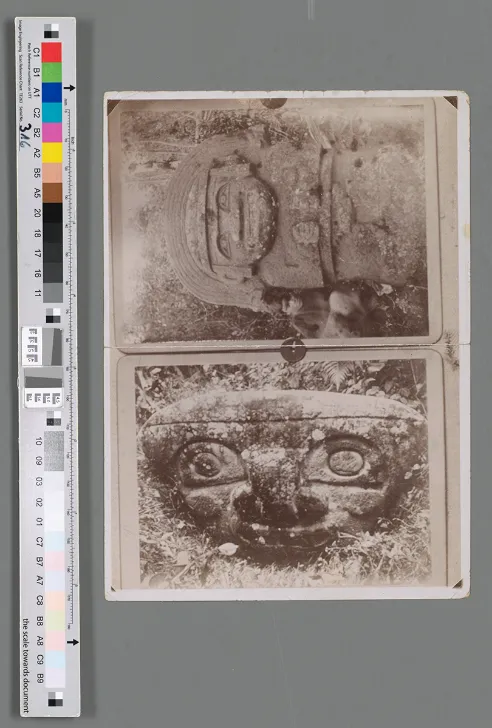 Descripción: Dos fotografías de estatuas de piedra de San Agustín (Huila) puestas sobre un folio de color beige. Alphons Stübel montó en folios de cartón la mayor parte de las fotografías adquiridas en el territorio colombiano, por compra o donación, con el objetivo de exponerlas en el Museo de Geografía comparada, localizado en la ciudad alemana de Leipzig, el cual fundó en 1896. Cabe mencionar que este museo fue cerrado en 1975 (Schuster y Neva, 2022, pp. 34-35).