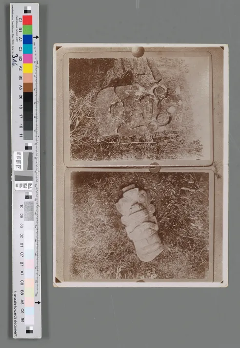 Descripción: Tres fotografías de objetos arqueológicos de Cundinamarca puestos sobre un folio blanco. Alphons Stübel montó en folios de cartón la mayor parte de las fotografías adquiridas en el territorio colombiano, por compra o donación, con el objetivo de exponerlas en el Museo de Geografía comparada, localizado en la ciudad alemana de Leipzig, el cual fundó en 1896. Cabe mencionar que este museo fue cerrado en 1975 (Schuster y Neva, 2022, pp. 34-35).