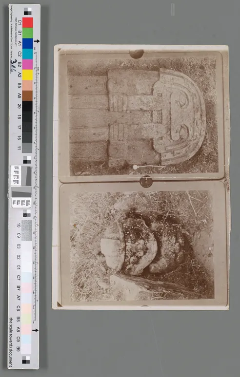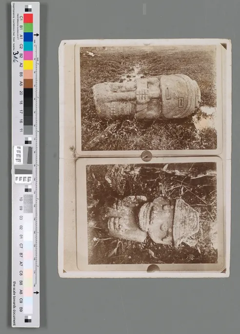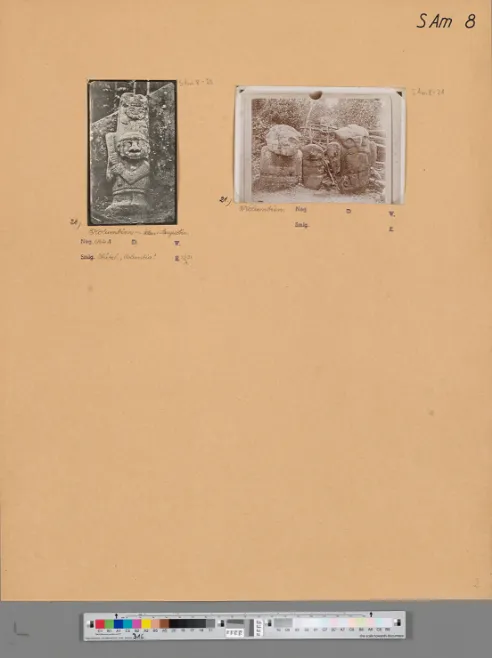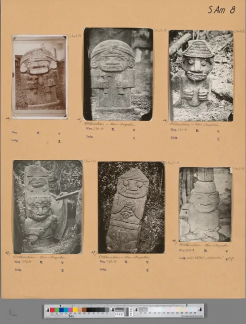 Descripción: Seis fotografías de estatuas de piedra de San Agustín (Huila) puestas sobre un folio de color beige. Alphons Stübel montó en folios de cartón la mayor parte de las fotografías adquiridas en el territorio colombiano, por compra o donación, con el objetivo de exponerlas en el Museo de Geografía comparada, localizado en la ciudad alemana de Leipzig, el cual fundó en 1896. Cabe mencionar que este museo fue cerrado en 1975 (Schuster y Neva, 2022, pp. 34-35).