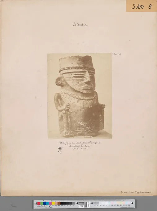 Descripción: Una fotografía de una cerámica de la guaca de Chirajara (Cundinamarca) puesta sobre un folio blanco. Alphons Stübel montó en folios de cartón la mayor parte de las fotografías adquiridas en el territorio colombiano, por compra o donación, con el objetivo de exponerlas en el Museo de Geografía comparada, localizado en la ciudad alemana de Leipzig, el cual fundó en 1896. Cabe mencionar que este museo fue cerrado en 1975 (Schuster y Neva, 2022, pp. 34-35).