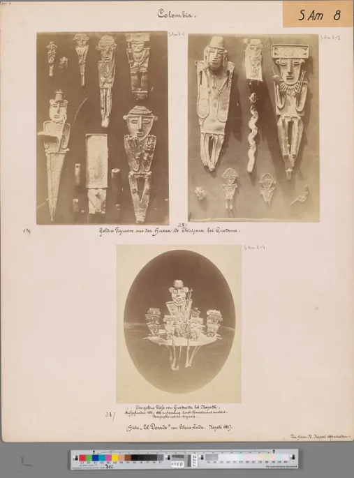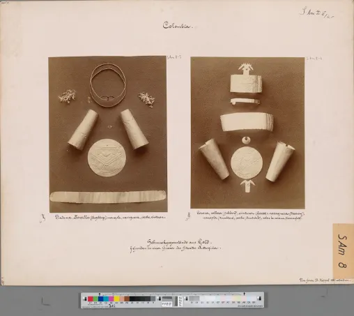 Título: Colombia: joyería de oro. Hallada en una huaca, departamento de Antioquia [Colombia: Schmuckgegenstände aus Gold. Gefunden in einer Huaca, des Staates Antioquia]