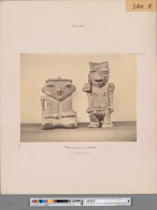Descripción: Dos fotografías de objetos arqueológicos puestos sobre un folio blanco. Alphons Stübel montó en folios de cartón la mayor parte de las fotografías adquiridas en el territorio colombiano, por compra o donación, con el objetivo de exponerlas en el Museo de Geografía comparada, localizado en la ciudad alemana de Leipzig, el cual fundó en 1896. Cabe mencionar que este museo fue cerrado en 1975 (Schuster y Neva, 2022, pp. 34-35).