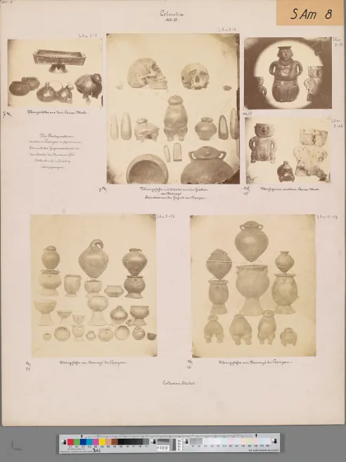 Descripción: Cinco fotografías de objetos arqueológicos provenientes de una guaca en Tacueyó, en Tierradentro (Cauca), puestas sobre un folio blanco. Alphons Stübel montó en folios de cartón la mayor parte de las fotografías adquiridas en el territorio colombiano, por compra o donación, con el objetivo de exponerlas en el Museo de Geografía comparada, localizado en la ciudad alemana de Leipzig, el cual fundó en 1896. Cabe mencionar que este museo fue cerrado en 1975 (Schuster y Neva, 2022, pp. 34-35).