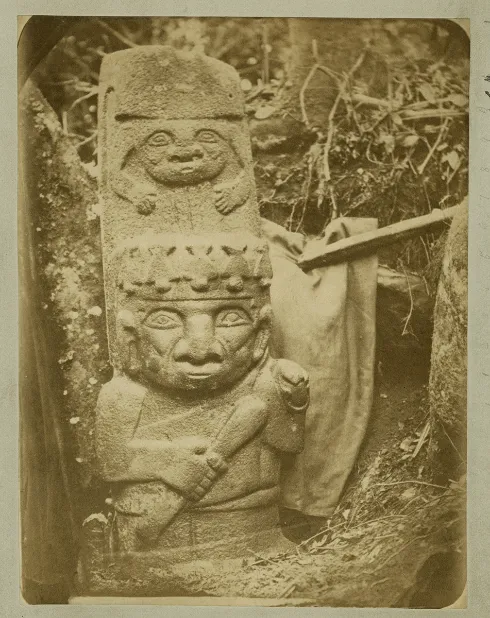 Descripción: Dos estatuas de piedra de San Agustín (Huila). Las piezas visuales de objetos arqueológicos y etnográficos no hicieron parte del esquema propuesto por Alphons Stübel para su exposición en el Museo de Geografía Comparada. La importancia de estas imágenes radica en el hecho de que permiten conocer cómo “la fotografía fue usada para crear registros visuales de los objetos arqueológicos encontrados en guacas o ‘lagos sagrados’” (Schuster y Neva, 2022, p. 322). La serie de fotografías de San Agustín fueron enviadas a Stübel, por parte de la señora M. Weis, en febrero de 1891 (Schuster y Neva, 2022, p. 322).