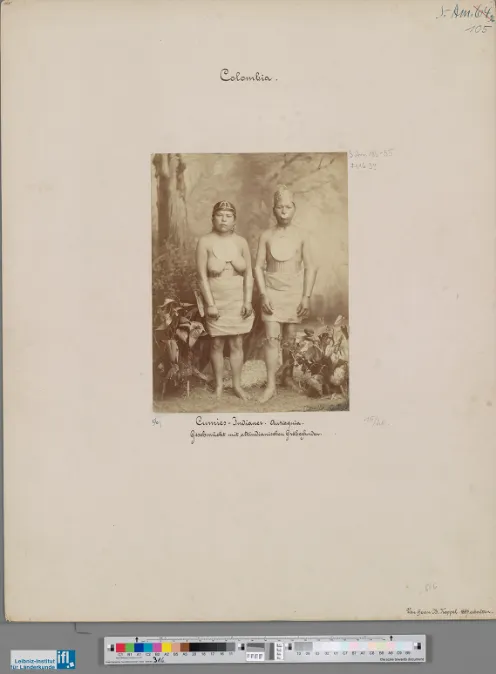 Descripción: Una fotografía de dos indígenas Cumics del departamento de Antioquia puesta sobre un folio blanco. Alphons Stübel montó en folios de cartón la mayor parte de las fotografías adquiridas en el territorio colombiano, por compra o donación, con el objetivo de exponerlas en el Museo de Geografía comparada, localizado en la ciudad alemana de Leipzig, el cual fundó en 1896. Cabe mencionar que este museo fue cerrado en 1975 (Schuster y Neva, 2022, pp. 34-35).