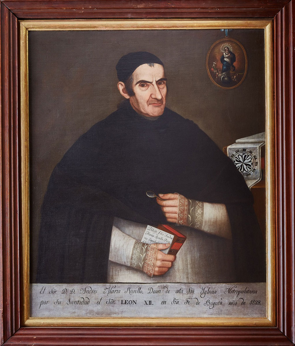 Andrés Rosillo y Meruelo (Villa del Socorro, 1758; Bogotá, 1835) vistió la beca del Colegio del Rosario, en 1773. Estudió Filosofía y Teología, cuyas cátedras ocupó luego. De 1787 a 1789 fue vicerrector interino y luego rector, en el periodo 1802-5. Su carrera eclesiástica inició en 1782, ordenado por el arzobispo Antonio Caballero y Góngora, en Tunja. En 1789, fue nombrado cura párroco de Simacota y luego, en 1799, obtuvo la canonjía magistral de la Catedral Metropolitana de Santafé. En la política, se vinculó al movimiento independentista desde 1809. Desterrado por Morillo a España, en 1816, volvió años después al país para seguir su carrera eclesiástica.