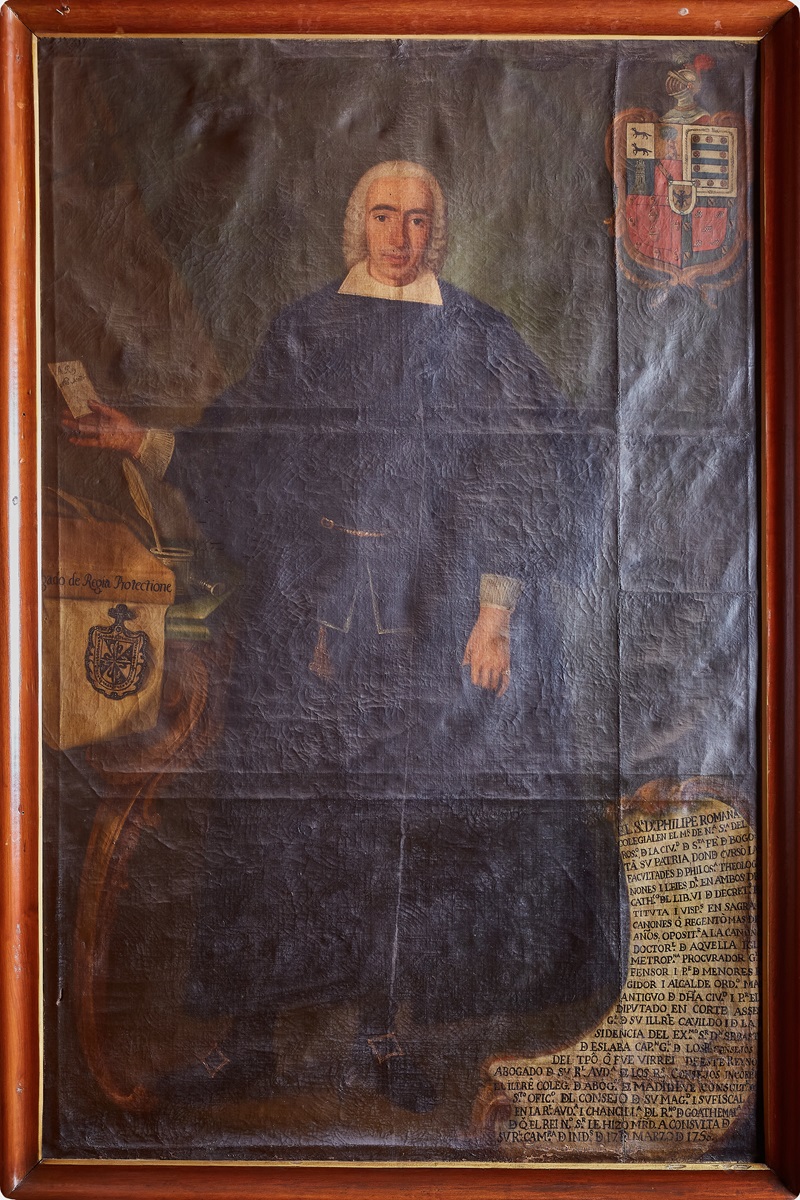 Formato vertical. Figura frontal, cuerpo entero, sentado; viste peluca, roquete de puños y cuello blanco, sotana negra con cíngulo de color café, atrochada con cinturón dorado en forma de perlas. En su mano derecha sostiene sobre blanco con la siguiente inscripción: “Al Rey Nro Señor”. A su derecha, mesa y sobre ella la beca del Rosario; tintero con pluma, libro. En su mano izquierda, sostiene guantes, anillo dorado en su dedo meñique. Cartela a su izquierda; escudo de forma española, cuartelado. Cuarteles 3 y 4, campo en gules y figuras en oro.