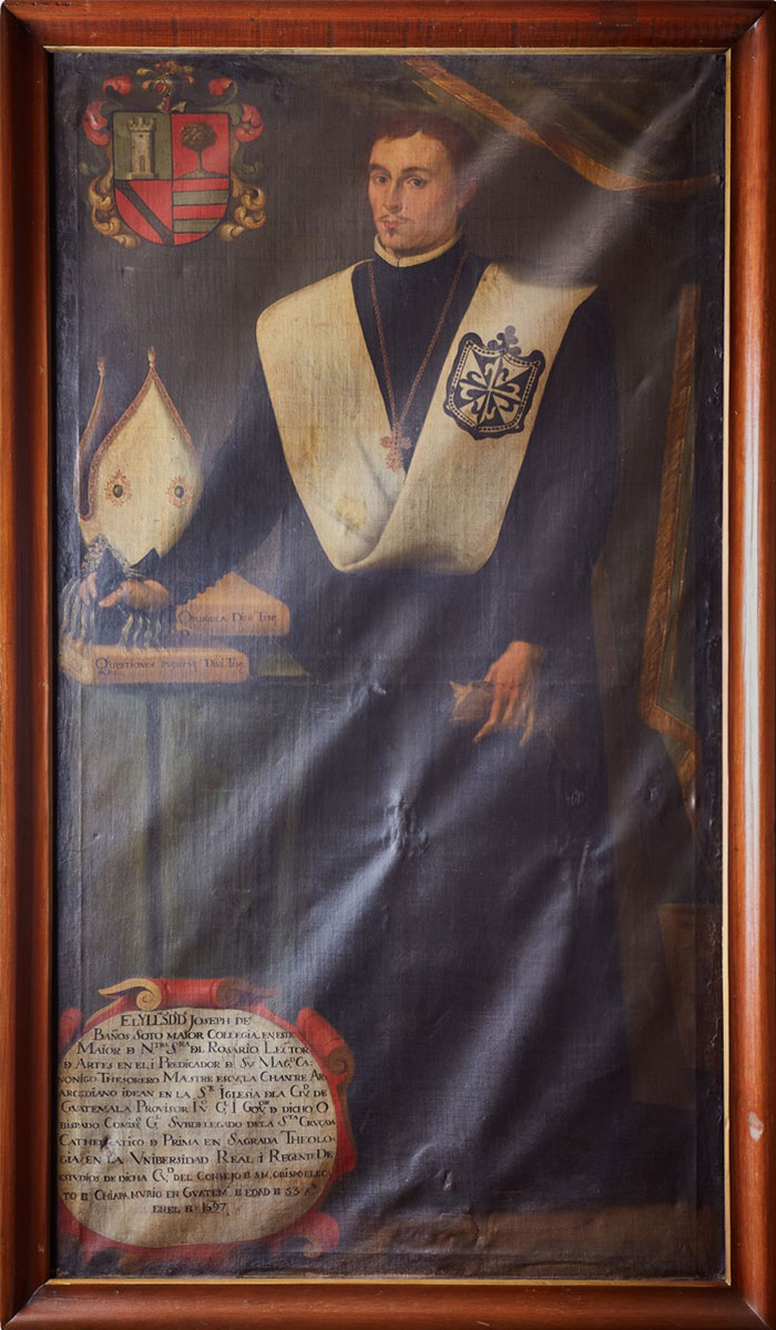 Otra parte de su carrera se relaciona con la Universidad de Guatemala, donde fue primer rector, en 1686, y catedrático de prima de Teología. La bibliografía reciente afirma que murió en 1696, contra el dato de la cartela, que pone 1697, de 53 años.