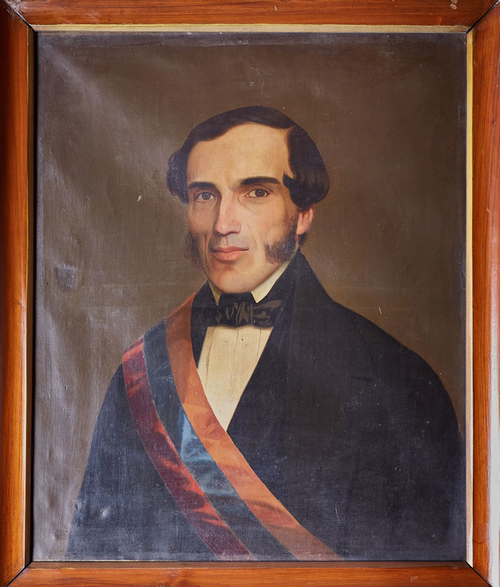 Formato vertical, figura de frente, medio cuerpo levemente girado a su derecha; luce patillas largas; lleva camisa blanca, corbata negra, chaqueta negra, banda tricolor de la República de Colombia, cruzada de derecha a izquierda.