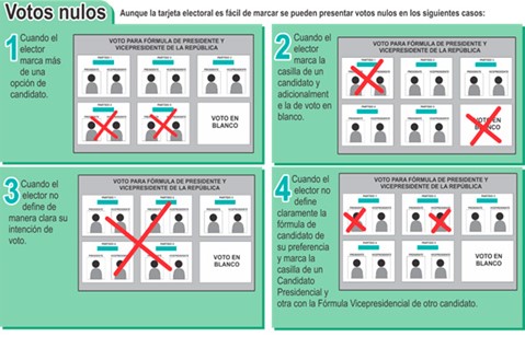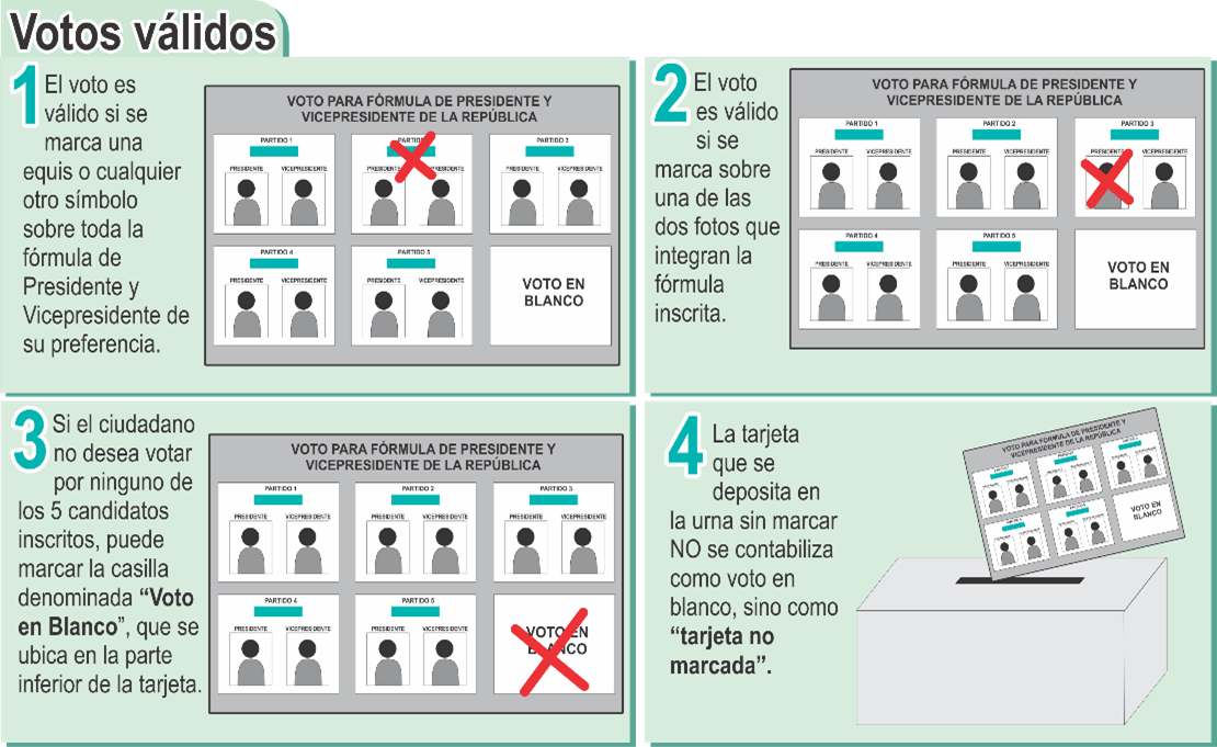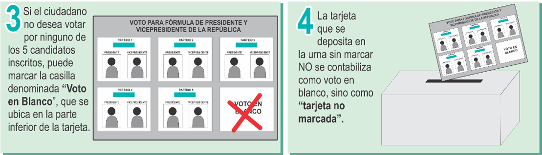 Los ciudadanos que no tengan preferencia por ninguno de los candidatos presidenciales que se encuentran en el tarjetón, podrán marcar la casilla del ‘voto en blanco’; para que este voto sea válido, el votante deberá solamente marcar en la casilla correspondiente con una “X” o con el símbolo que permita inferir su intención de voto, en ninguna otra casilla.