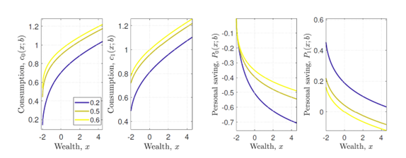 La Figura 1 muestra la dependencia de las decisiones de consumo y ahorro con respecto al beneficio de desempleo (b). Como era de esperar, las prestaciones por desempleo pueden ayudar a mantener el nivel de consumo de los trabajadores desempleados, ya que el consumo óptimo tanto de los desempleados como de los empleados aumenta con b. Además, el desahorro de los desempleados aumenta con las prestaciones, mientras que el ahorro por precaución de los trabajadores ocupados disminuye con b. Note que en esta economía los agentes se pueden endeudar.