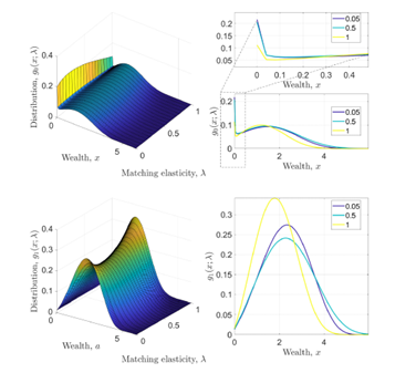 En la Figura 2 se representan las densidades g0 y g1 de la distribución de la riqueza de los desempleados y los trabajadores empleados y la dependencia de los cambios en la distribución estacionaria de la riqueza de la elasticidad de emparejamiento del desempleo y el beneficio de desempleo. Se observa que las fricciones de búsqueda y la tasa de sustitución producen cambios significativos en la distribución de la riqueza. En particular, a medida que aumenta b, también lo hace la concentración de desempleados en el límite de la deuda.