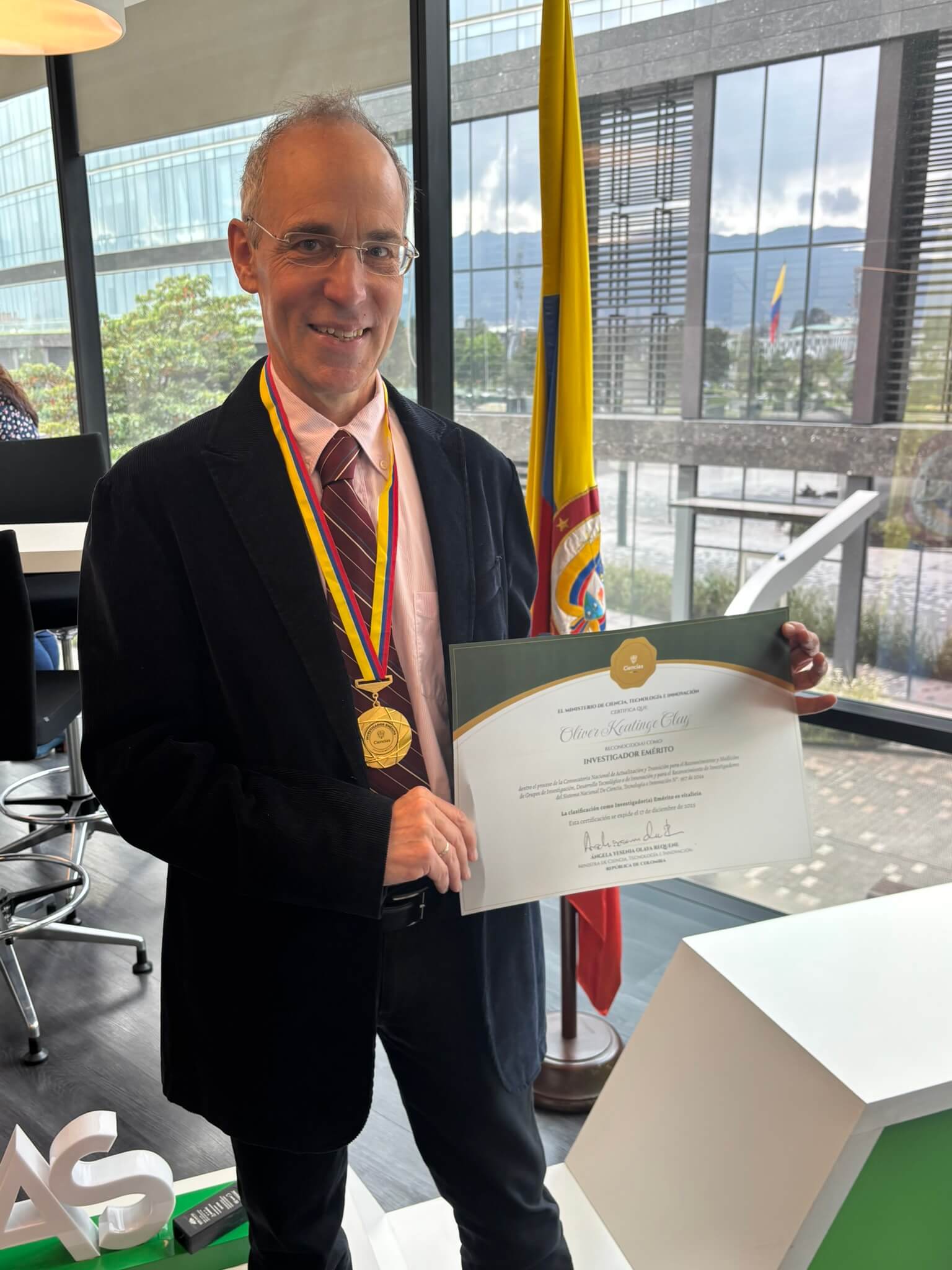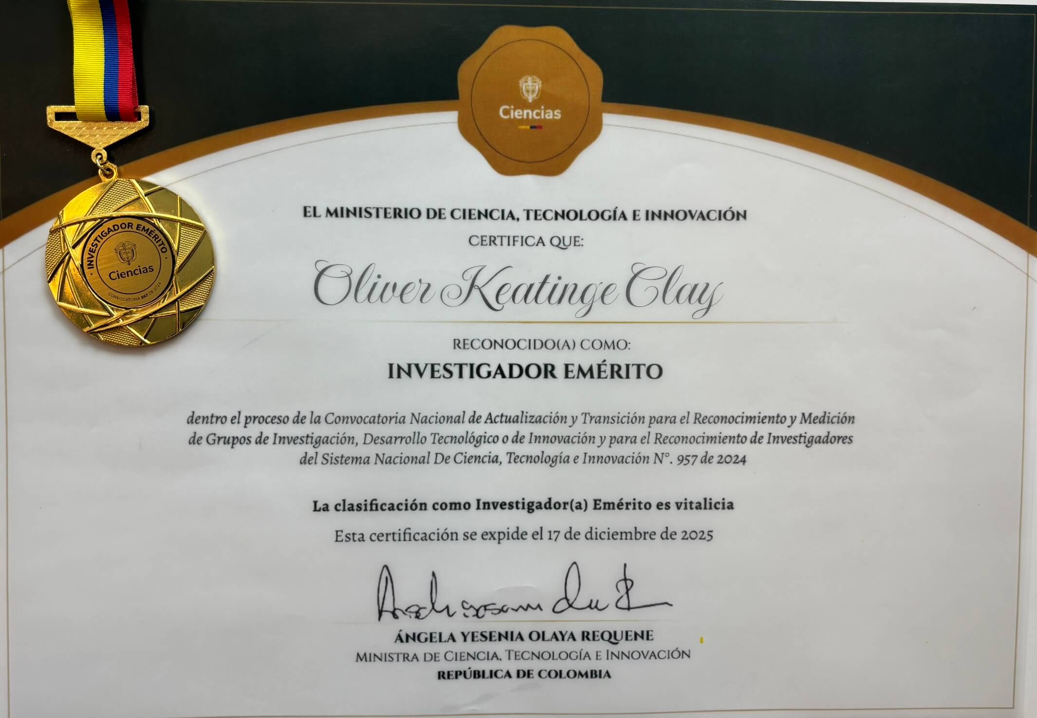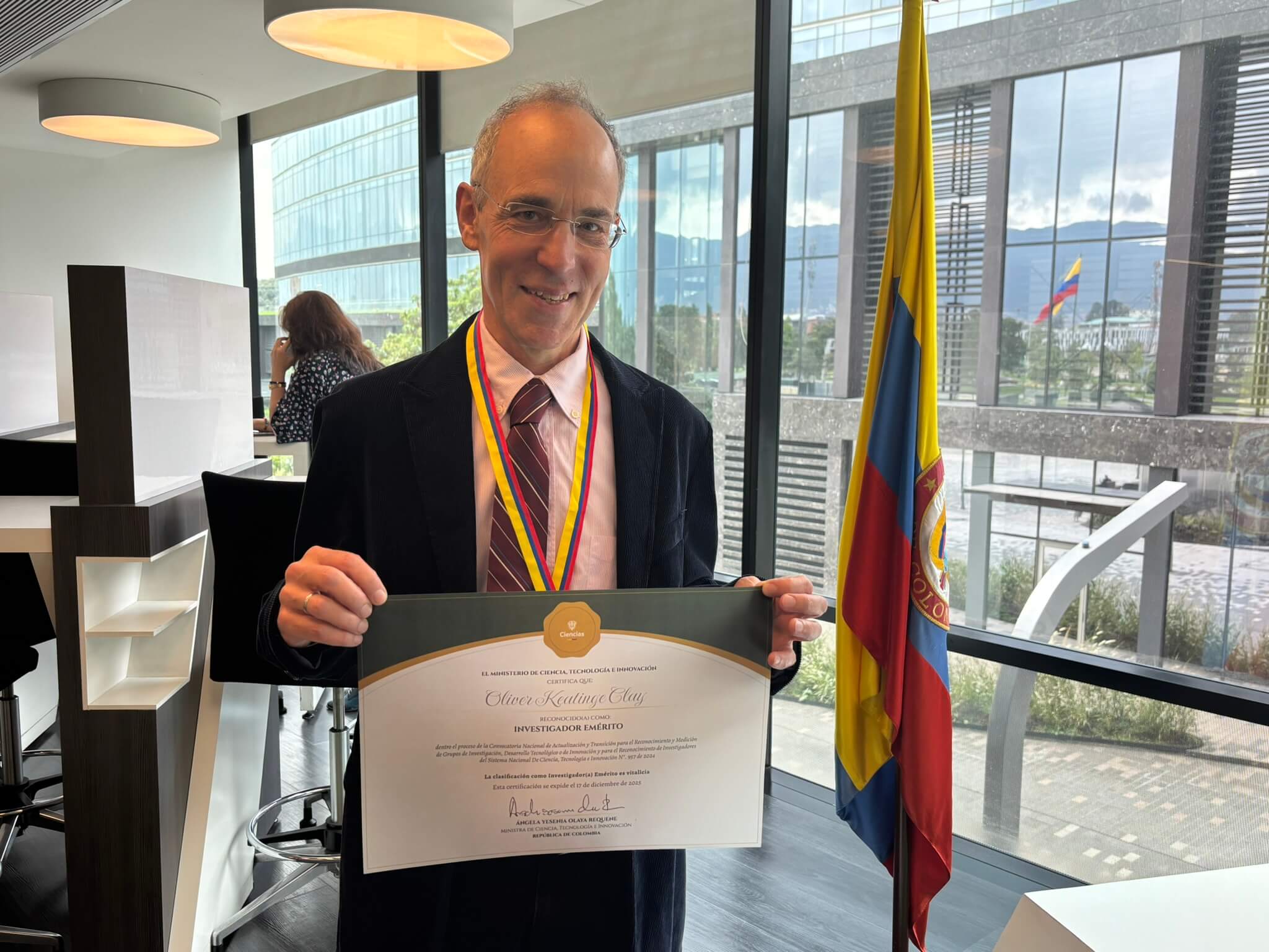 “Este reconocimiento al profesor Oliver Keatinge Clay es un orgullo para nuestra comunidad académica. Su dedicación, rigor científico y compromiso con la formación de estudiantes e investigadores ejemplifica los valores que promovemos en la Universidad del Rosario. El título de Investigador Emérito otorgado por Minciencias es un logro que nos inspira a seguir fortaleciendo nuestras capacidades de investigación y a contribuir al desarrollo científico del país”.