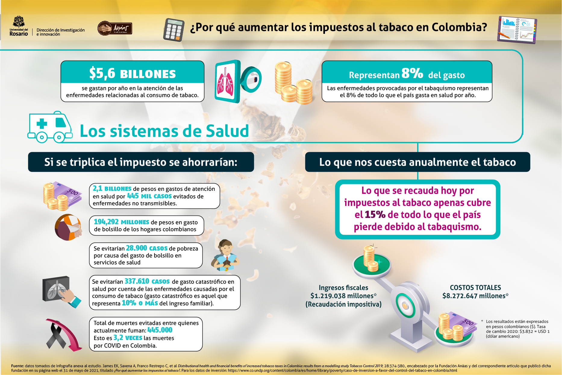 Evidentemente, “no solo este estudio, sino otros realizados por la Fundación Anáas y otros grupos de investigación en la región evidencian que Colombia todavía soporta un buen rango de aumento de los impuestos al tabaco”, opina, por su parte, el investigador Juan Miguel Gallego Acevedo, director de Investigación e Innovación de la Universidad del Rosario, profesor de la Facultad de Economía de la misma Institución y líder del grupo de investigación del estudio.