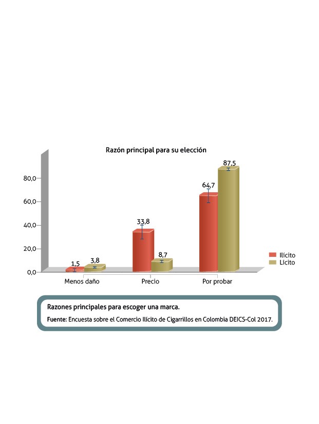 Las cifras registradas por esta institución demuestran que la mitad del comercio del cigarrillo en Colombia se da en el terreno de la informalidad, principalmente en la modalidad de menudeo (lo cual está prohibido en el país. Ley 1335 de 2009). Y que la mayoría de los consumidores de cigarrillo convencional están ubicados en los estratos 2 y 3